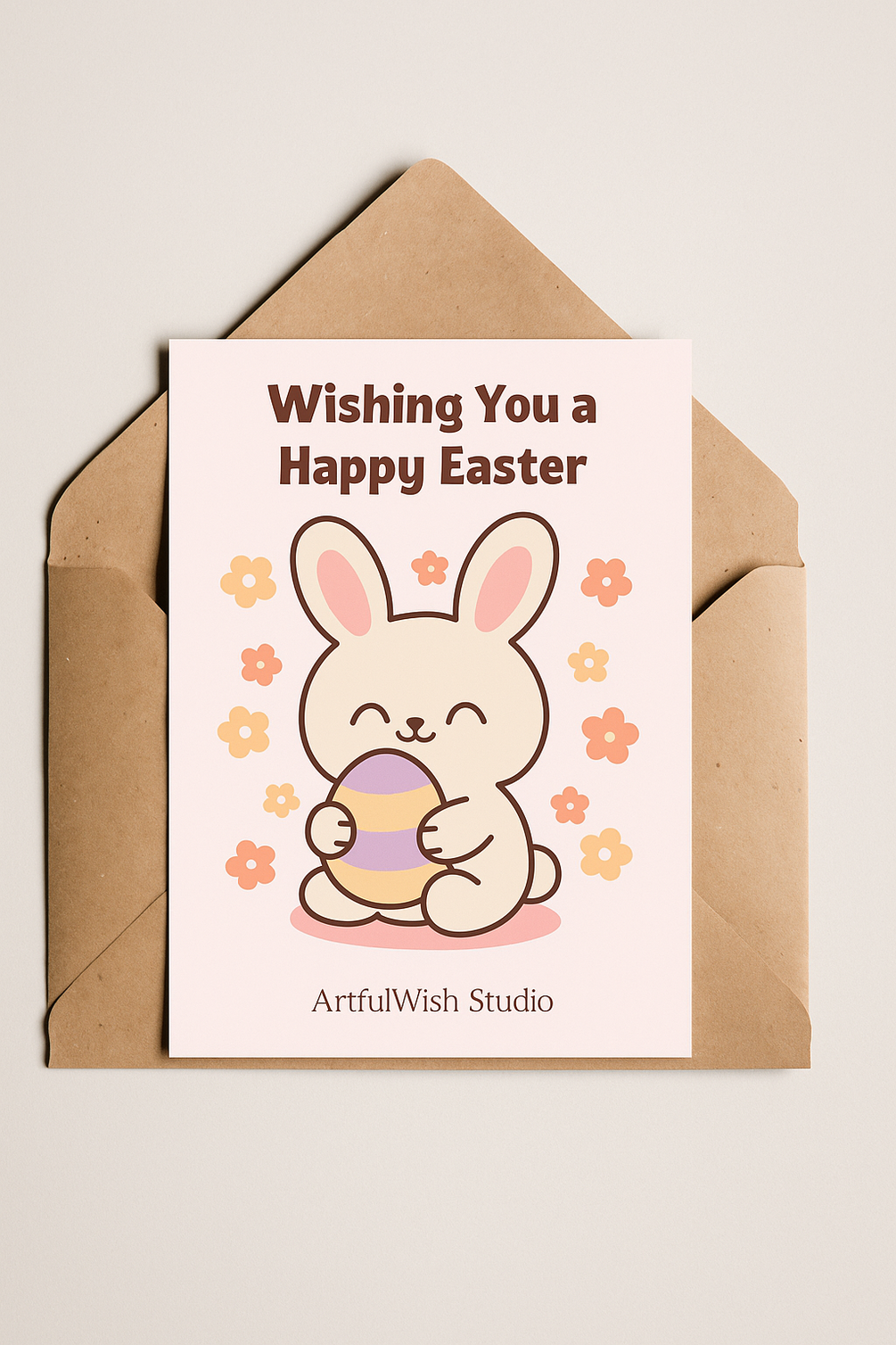 Brighten someone’s Easter with this sweet bunny holding a pastel egg surrounded by spring flowers. This cheerful card is a lovely way to say “Happy Easter” to friends, family, or little ones.