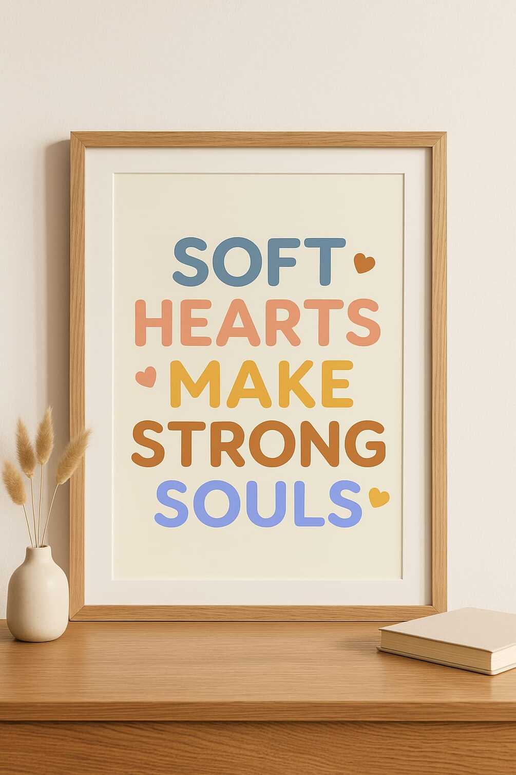 Bring a touch of kindness and strength to your space with this colorful, uplifting printable wall art. Featuring the heartfelt quote “Soft Hearts Make Strong Souls” in a cute, aesthetic style, this digital print is perfect for bedrooms, nurseries, home offices, or cozy corners.